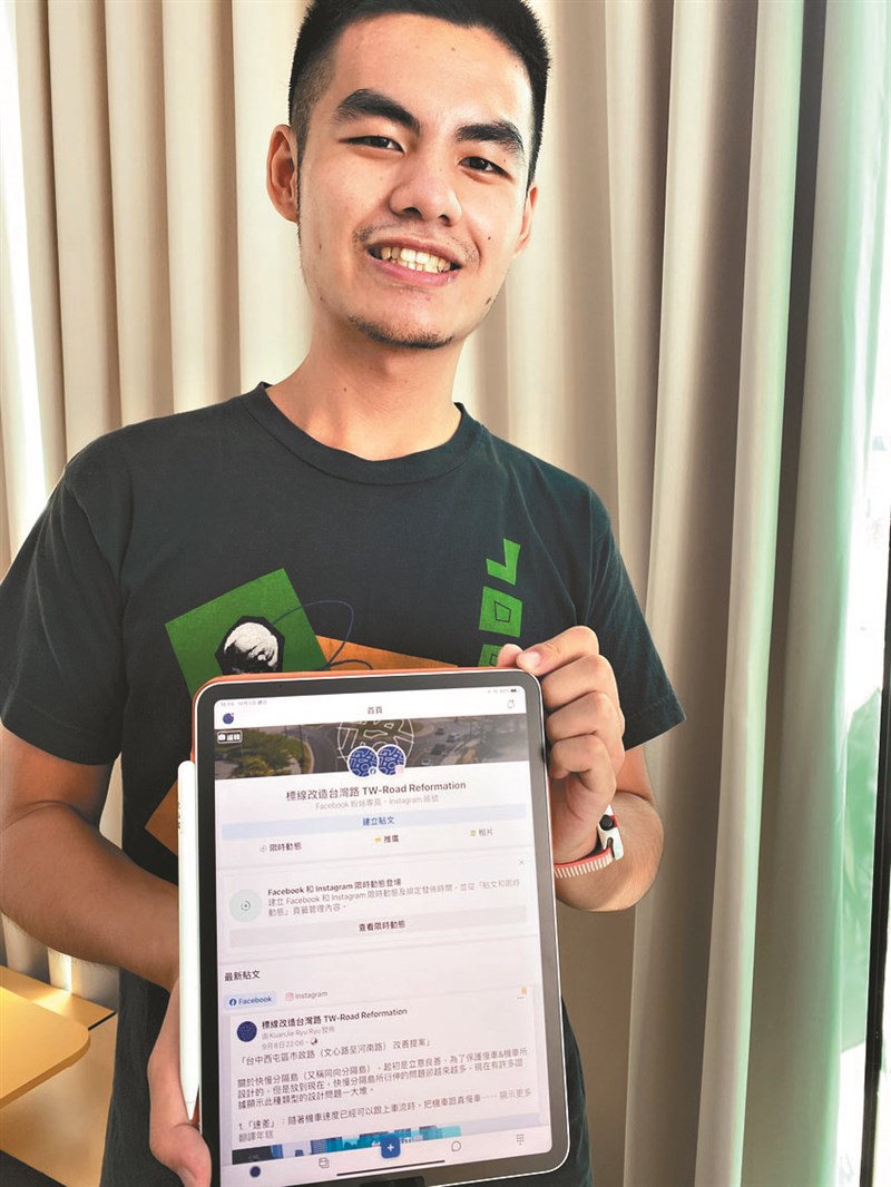 【本報台南訊】今年剛從大學畢業的劉冠頡,之前有到歐洲做交換學生的經驗,發現歐洲的道路「怎麼這麼好開(車)」,返台後自創「標線改造台灣路」粉專,分享改造台灣道路標線的想法,沒想到獲得廣大回響,最近並與高雄市政府合作,改造多條道路標線,從素人變專家,原本大學念的與交通無關,但下一步想考交管研究所,為台灣道路改造盡一分心力。