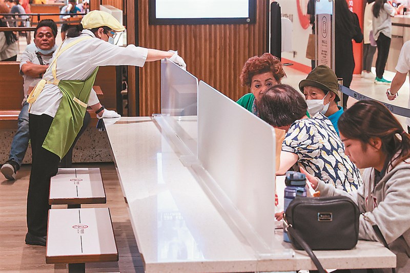 指揮中心昨日宣布,今起餐飲業的防疫規範可放寬,包含內用不限隔板或1.5公尺間距。