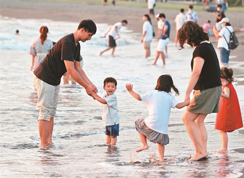 即日起海邊戲水可暫時脫下口罩,圖為昨日高雄旗津沙灘上,看到民眾享受難得的悠閒。 圖/劉學聖