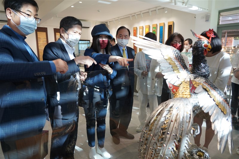 文化部長李永得、全聯善美的基金會董事江蕙、全聯林敏雄董事長在巧藝館欣賞錫工藝人間國寶陳萬能作品《牡丹鳳凰》。圖/全聯善美的文化藝術基金會提供