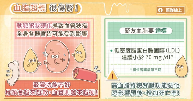 掌控血脂 預防翹翹板效應 |2021.10.07 語音朗讀 1440觀看次 字級 大 中 小 控制三酸甘油脂TG後,低密度脂蛋白膽固醇LDL-C可能爬升,兩者的關係就像翹翹板一樣。圖/unsplash 【本報台北訊】四十多歲的李先生是位上班族,多年的糖尿病讓他的腎臟功能變得比較差,而且高血脂的問題也讓他相當在意。「醫師,我的三酸甘油脂TG之前都很高,吃藥一段時間後,三酸甘油脂已經漸漸達標」李先生拿著一疊抽血報告,憂心地問:「可是,最近驗的低密度脂蛋白膽固醇LDL-C卻愈爬愈高,為什麼會這樣啊?」「這個現象叫做翹翹板效應,臨床上還蠻常見的。」高雄長庚醫院腎臟科楊智超醫師指出,「腎臟功能較差的患者,心血管疾病的風險較高,不僅低密度脂蛋白膽固醇LDL-C要達標,也同時要考慮到病人更常會合併高三酸甘油脂以及偏低的高密度脂蛋白膽固醇HDL,需要更積極的治療來控制混合型高血脂的問題,不過,控制三酸甘油脂TG後,低密度脂蛋白膽固醇LDL-C可能爬升,兩者的關係像翹翹板一樣。」圖/unsplash經常被稱為「壞膽固醇」的低密度脂蛋白膽固醇LDL-C若是超標,對心血管相當不利,對於慢性腎衰竭的病人來說,偏高的三酸甘油脂更是反映出這些低密度脂蛋白膽固醇的顆粒比較小,楊智超醫師說,顆粒愈小的低密度脂蛋白膽固醇可以用地溝油來比喻,因為更容易會造成粥狀動脈硬化斑塊(plaque)。為了解決這樣的問題,可以併用不同機轉的藥物,幫助患者改善血脂肪的質與量,以免顧此失彼。血脂超標,傷心又傷腎!高血脂是極為常見的問題,常用的指標包括三酸甘油脂(TG,triglycerides)、高密度脂蛋白膽固醇(HDL-C,high-density lipoprotein cholesterol)、低密度脂蛋白膽固醇(LDL-C,low-density lipoprotein cholesterol)。楊智超醫師解釋,僅膽固醇過高,稱為「高膽固醇血症」;僅三酸甘油脂過高,稱為「高三酸甘油酯血症」;若是兩者皆超標,稱為「混合型高血脂症」。有些膽固醇高得很離譜的患者,皮膚上會出現「黃色瘤」,一顆顆像米粒大小,黃色或橘黃色的丘疹,楊智超醫師提醒,大多數患者在血脂超標時往往沒有明顯症狀,需要抽血檢驗才能察覺,千萬不能因為沒有症狀而輕忽高血脂的危險性。高密度脂蛋白膽固醇HDL-C是好膽固醇,至於低密度脂蛋白膽固醇LDL-C與三酸甘油脂TG超標時,可能產生粥狀動脈硬化,導致血管狹窄、阻塞,使心臟、腎臟、腦部等各個器官的功能受到影響。慢性腎臟病或者接受透析的病人,大概50%都有糖尿病,是最高心血管風險的病人,歐美心臟學會所發佈的治療指引都認為對這一個高風險的族群,治療要愈來愈積極。楊智超醫師解釋,腎臟病患者還有一個較特別的現象「高血磷」,可能進一步讓血管鈣化。因為腎臟功能不好,無法排除體內的磷,當血中的磷升高,會刺激副甲狀腺素分泌,副甲狀腺素上升則讓骨頭釋放出鈣和磷。除了導致骨質疏鬆,多餘的鈣和磷會沉積在血管壁,使血管鈣化。地溝油的存在也會進一步的促進這樣的血管硬化和骨質疏鬆的現象。「腎臟不好,骨頭會愈來愈軟,血管則會愈來愈硬!」楊智超醫師說,高血磷將衍生骨質疏鬆、骨折、血管鈣化等多種併發症,都會影響慢性腎臟病患者的預後及死亡率。大家對於低密度脂蛋白膽固醇LDL-C都很熟悉,因為是不好的,所以可以叫它為回鍋油,不過低密度脂蛋白膽固醇LDL-C其實還可以分為大顆粒、中顆粒、小顆粒,楊智超醫師用淺顯易懂的比喻解釋,「小而緻密的低密度脂蛋白膽固醇(sdLDL-C,small dense low density lipoprotein)」常見於慢性腎衰竭尤其是合併糖尿病的病人身上,就像是地溝油,地溝油相較回鍋油更加劣質,對身體造成更壞的影響,也就是說當sdLDL-C在血液中滯留更長的時間時,更容易被巨噬細胞吞下去形成泡沫細胞,就會對心血管造成危害。因此,在治療高血脂時,除了關心低密度脂蛋白膽固醇LDL-C,也希望可以降低小而緻密的低密度脂蛋白膽固醇sdLDL-C。積極治療,預防翹翹板效應根據治療指引,對於高血脂的建議愈來愈積極,楊智超醫師說,針對慢性腎臟病第三期的患者,便建議將低密度脂蛋白膽固醇LDL-C控制到70 mg/dL以下;針對慢性腎臟病第四期進入透析、心血管風險更高的患者,甚至建議降到55 mg/dL以下。愈來愈多證據顯示,積極控制高血脂對患者有保護效果,目前已有多種藥物可以使用。臨床上常見到患者的低密度脂蛋白膽固醇LDL-C達標,但是三酸甘油酯TG依舊比較高,楊智超醫師說,我們都會積極處理,以降低相關風險。「使用降三酸甘油酯TG的藥物時,患者的低密度脂蛋白膽固醇LDL-C可能會代償性上升,像翹翹板一樣,」楊智超醫師解釋,「翹翹板效應跟身體的膽固醇生成路徑有關係,你阻斷了一個,另外一個會代償性的上升。如果想要將三酸甘油酯TG壓的愈低,低密度脂蛋白膽固醇LDL-C的上升情形也會更加顯著,這是經常遇到、較為困擾的狀況。」「很多慢性腎臟病患者的三酸甘油酯TG都高到300至400 mg/dL,甚至大於500 mg/dL。三酸甘油酯TG很高時,急性胰臟炎的風險會上升,必須積極控制。在降低三酸甘油酯TG的過程中,若沒有考慮到低密度脂蛋白膽固醇LDL-C上升的話,便會有一點顧此失彼。」,楊智超醫師說,「對於慢性腎臟病的病人合併有混合型血脂異常,要預防翹翹板效應,又希望可以改善血脂的質與量,就得運用不同機轉的藥物。例如含有Niacin成份的複方降血脂藥物,除了藥錠本身有statin,可以有效降低LDL,Niacin不會造成TG的反跳,提供了一個