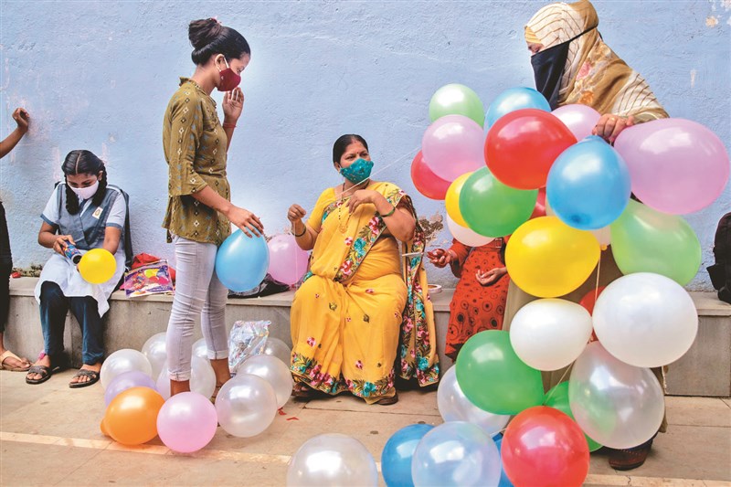 印度孟買達拉維1所學校4日結束防疫停課期,部分恢復實體課程,學生與職員將氣球充氣布置校園。