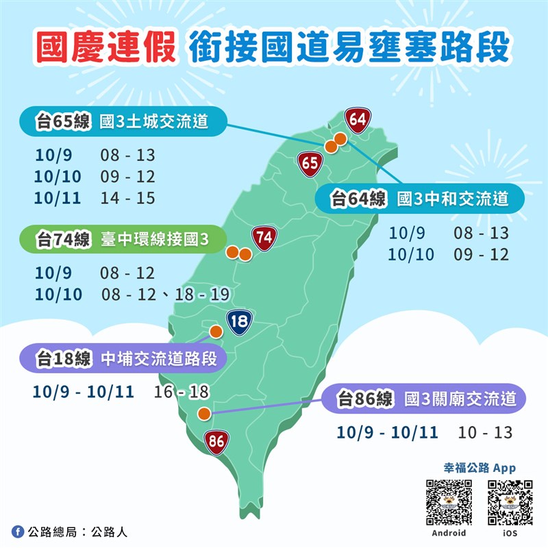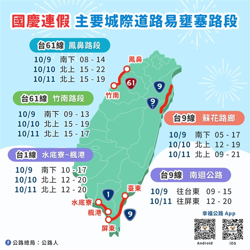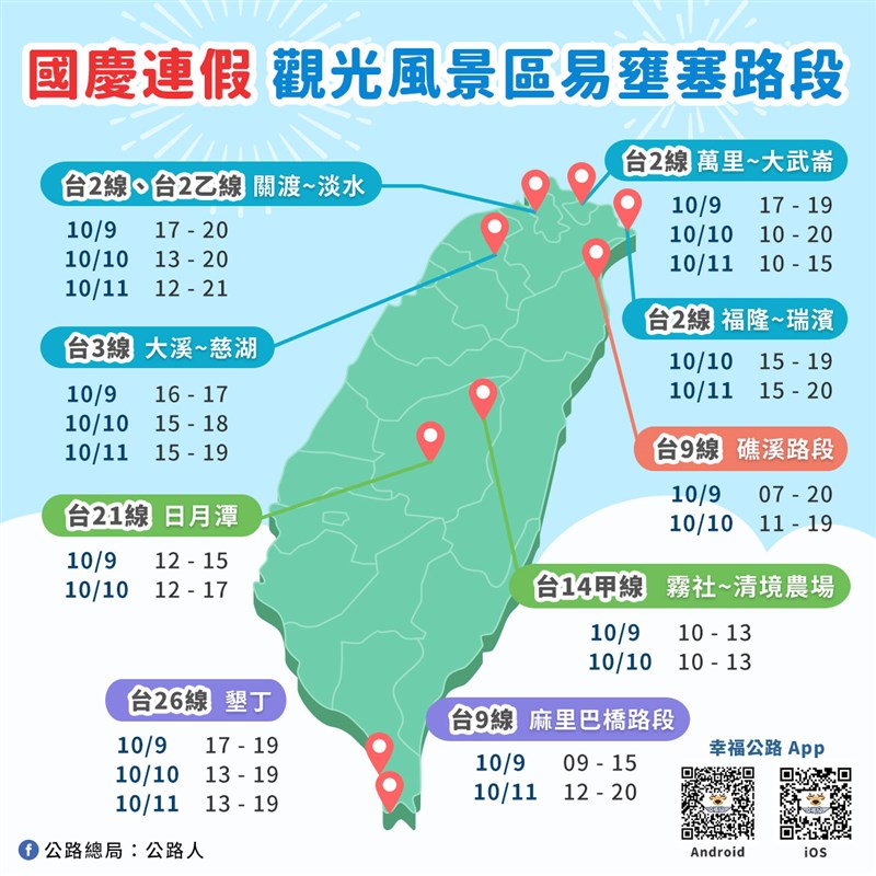 連假觀光人潮湧現 今17路段易塞 |2021.10.10 語音朗讀 828觀看次 字級 大 中 小 昨日是國慶連假首日,一早國道部分路段出現車潮,國道3號南下車多壅塞,車輛大排長龍。圖╱中央社 【本報台北訊】今天是國慶連續假期第2天,交通部公路總局預估,今天各風景區及國慶日活動地點,將會湧現觀光旅遊車潮,包括台65線、台64線、台61線、台74線等17大部分路段,呼籲民眾多加使用替代道路。公路總局表示,昨日自凌晨起即開始出現返鄉出遊車潮,往返南北及花東地區的省道城際道路,如台61線鳳鼻路段及竹南路段、台9線蘇花路廊上午皆出現車多壅塞情形,而連接國道3號的台74線大里至霧峰路段、快官至成功路段受高速公路匝道儀控及國道車流較多影響,昨日部分觀光景點如台2線大武崙、福隆~瑞濱及台2乙線關渡~淡水路段也出現車多情形。國慶連假加上紙本5倍券上路,預估今日各風景區及國慶日活動地點會湧現觀光旅遊車潮,將會有銜接國道、地區性主要幹道及部分旅遊觀光景點路段壅塞情形。包含台65線至國道3號土城交流道、台64線至國道3號中和交流道、台61線鳳鼻路段、台74線環線主線、快官、霧峰交流道(台中環線)、台18線(中埔交流道)路段、台86線歸仁交流道—台19甲線路口(國道3號關廟交流道)、台2線福隆~瑞濱及萬里~大武崙路段、台2線及台2乙線關渡~淡水路段、台3線及台7線大溪~慈湖地區、台14甲線霧社至清境農場路段、台21線日月潭周邊(九龍路口至水社路段)、台26線墾丁路段、台1線水底寮路口、台9線麻里巴橋路段、台9線礁溪路段及蘇花改路段等。公路總局說,為疏運民眾返鄉及外出乘車需求,已協調客運業者視人潮機動增班,昨日西部國道客運共計行駛5248班次,疏運8萬6540人;東部國道客運路線共計行駛1290班次,疏運2萬2829人。圖/取自臉書 前一篇文章 連假+5倍券助陣 景區塞滿人車 下一篇文章 圓規颱風今晚8時海警 北東明後天防豪雨 熱門新聞 01土方之亂推高成本 房價漲壓浮現2026.02.0202【遨遊藝事】巴黎 黛瑪兄弟茶館(Dammann Frères)2026.02.0603向前有路 光明在望2026.02.050410年前震倒115死 台南維冠改建防震7級大樓2026.02.0605菜市場變書房 攤商兒放學安心讀2026.02.0206極樂寺彩繪燈籠 三好理念廣傳校園2026.02.040730冊佛教徒必讀經典 台北書展亮相2026.02.0408佛教藝文本土化 昆士蘭美術館團隊訪中天寺2026.02.0509兩岸新聞營師生 認識人間佛教2026.02.0510立春養生疏肝理氣 飲食調養少酸多甘2026.02.04 訂閱電子報 台北市 天氣預報 台灣一週天氣預報 相關報導 日月潭神祕黑洞台北書展對話 佛光山安定動盪人心蘭潭景區升級 大白熊迎春基隆20億元 購123輛電動公車3D彩繪 新湖漁港活起來10年前震倒115死 台南維冠改建防震7級大樓