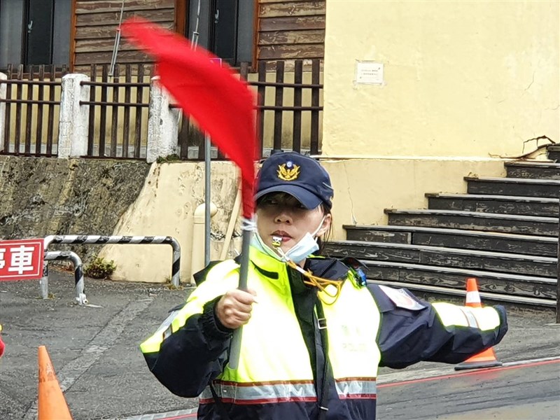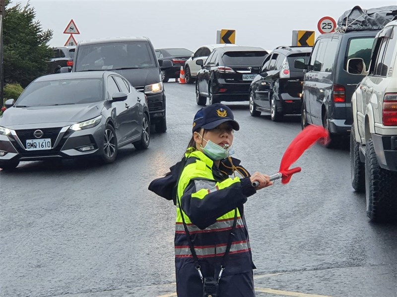 在合歡山氣溫只有9.8℃下,女警李沛勤仍站7小時疏導車流。圖/新城警分局提供
