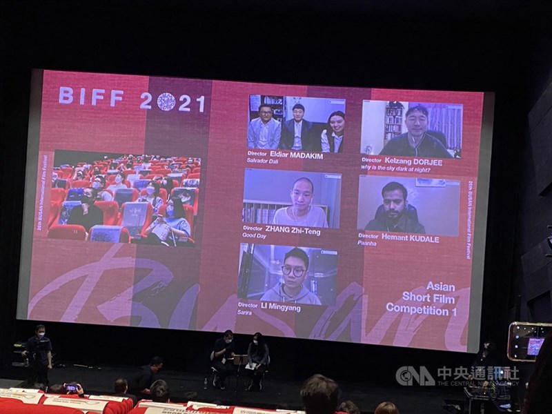 釜山影展11日在播映超廣角亞洲短片競賽單元入圍作品後,舉辦對談活動,來自台灣的「詠晴」導演張誌騰(中排右二視窗)與其他4名導演透過視訊方式出席,接受觀眾提問。圖/中央社