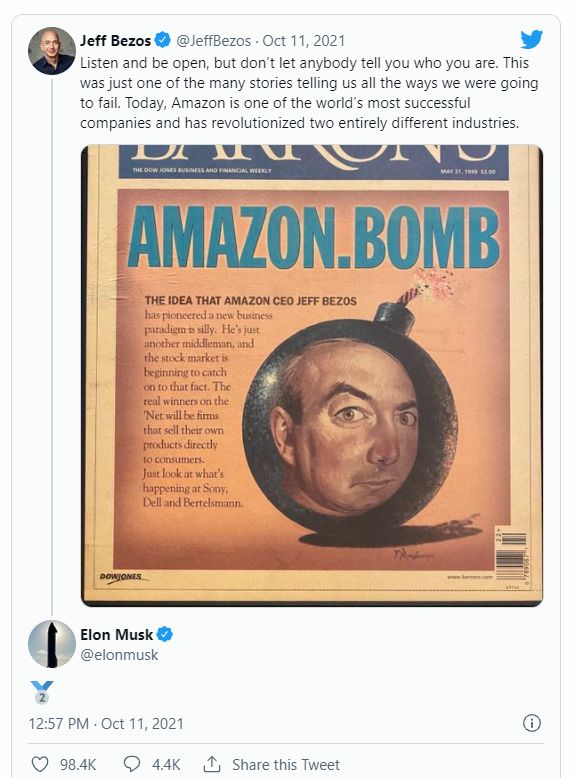有趣的是,貝佐斯11日在推特上發布一張,1999年亞馬遜公司被預測將殞落的周刊封面,並表示「別相信任何說你將失敗的人」,結果馬斯克竟然轉發這則推文,還揶揄地附上一個「銀牌」的表情符號,挑釁之餘也凸顯兩人之間較勁的意味相當濃厚。