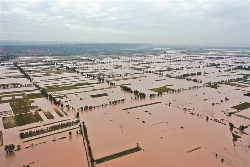 山西省河津市連伯村,附近蓄滯洪水的黃河灘地。圖/新華社