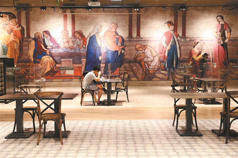 疫情期間,國內百貨美食街生意不若以往,造成餐飲業負擔。圖/中央社