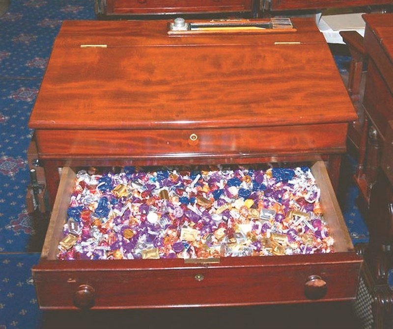 這張糖果桌裡塞滿巧克力、棒棒糖和其他甜食,即使在最費心思的投票環節,也可以讓參議員們甜甜嘴,超過半世紀以來,替他們帶來伴隨著罪惡感的愉悅。