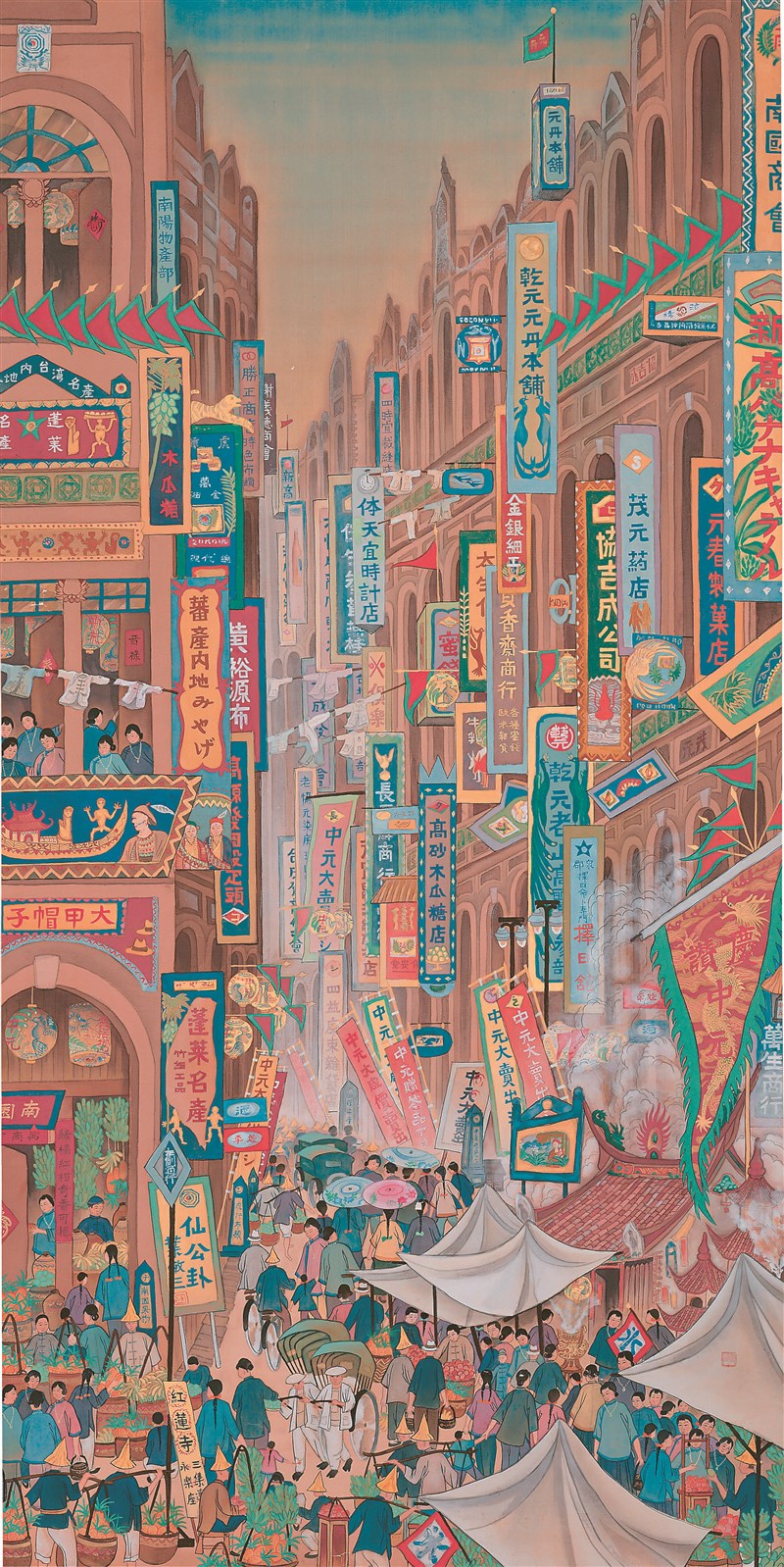 郭雪湖繪於一九三○年的〈南街殷賑〉,被認為最能代表文協年代的社會氛圍、藝術活力,「南街」位於今日迪化街南段,郭雪湖運用獨特的透視法,描繪大稻埕中元節時的繁華街景;電影《大稻埕》中,男主角宥勝就是看到這幅畫,穿越到百年前,電視劇《紫色大稻埕》也以此畫為背景,並發展桌遊等文創商品。