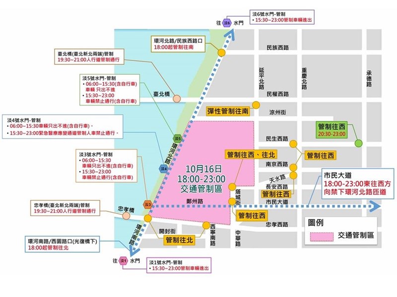 交通局指出,因應活動人車潮,其周邊道路於晚間6時至11時期間實施交通管制,管制範圍包含涼州街以南、延平北路及塔城街以西、長安西路及忠孝西路以北、環河北路(含)以東等區域,且市民大道高架橋往西方向車流禁止下環河北路匝道。