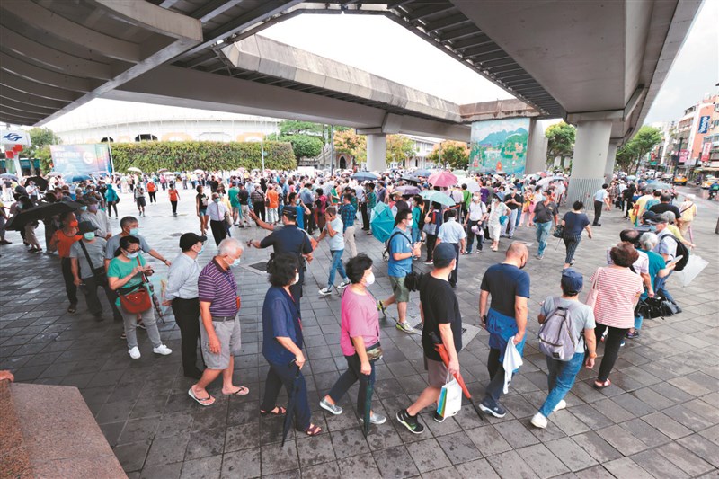 花博爭艷館接種站昨天上午出現出現爆滿接種人潮,從台北捷運圓山站一直排到花博爭艷館,民眾在雨中等待,平均要花1至2小時才接種完成,民怨四起。圖/蘇健忠