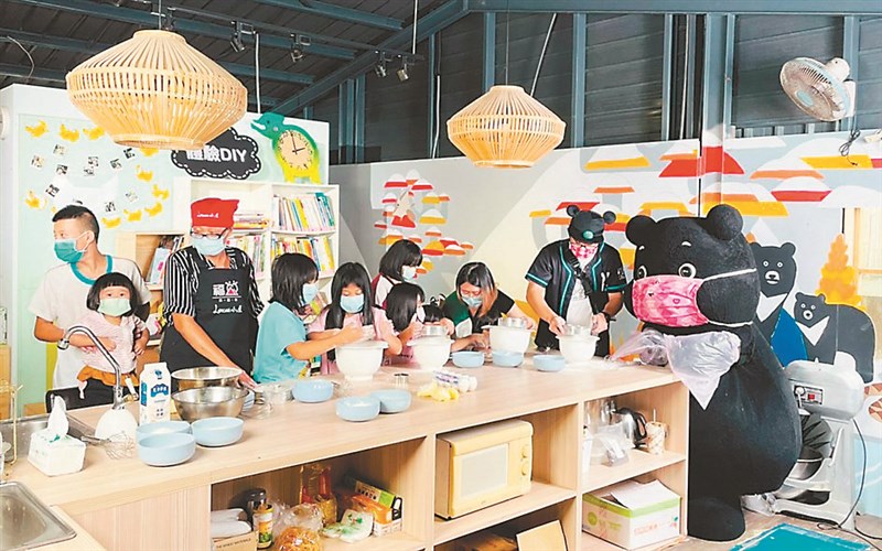 熊讚(右一)今年首度擔任家扶「甘苦生活節」愛心大使,陪福山部落孩子做甜點。圖/家扶基金會提供
