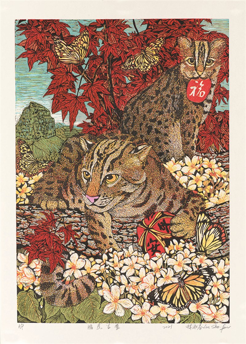 林淑芬的〈福虎生豐〉,利用台灣石虎作為吉祥象徵。圖/國美館提供