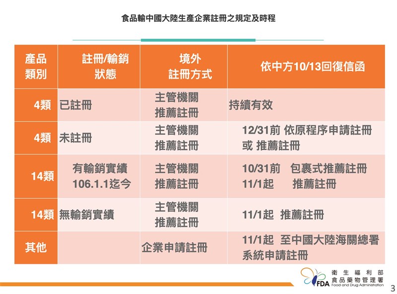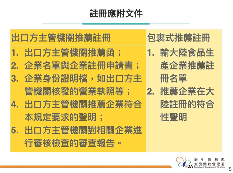 陸食品新令衝擊 鳳梨酥等18類限10/22前註冊 |2021.10.15 語音朗讀 2095觀看次 字級 大 中 小 新聞示意圖。圖╱取自維基 【本報台北訊】中國大陸海關總署今年4月12日,對外公布「中華人民共和國進口食品境外生產企業註冊管理規定」,要求所有國家或地區,舉凡要進口食品至大陸,須由所屬國家或地區統一送件申請,新制明年元旦生效。衛福部食藥署今緊急召開記者會對外說明,所有國內外銷業者與生產企業、農民團體,必須在10月22日以前完成線上註冊,助台灣於10月底前,送交推薦函、註冊名單,向中國大陸海關總署提出申請審核註冊。食藥署長吳秀梅表示,大陸4月中旬發布新制後,細節一直沒有公布,直到前天才寄出信件通知台灣,所有進口到大陸的進口食品,申請包裹式的企業註冊必須要在10月底前完成,否則後續就以「個案」方式,自行申請,屆時將會增加申請認證難度,也會延宕出口大陸的時間。食藥署要求業者10月22日以前上平台登記。圖/食藥署提供依照大陸的規定,需要提出申請的進口食品,總計有18類,包含肉與肉製品、腸衣、水產品、乳品、燕窩與燕窩製品、蜂產品、蛋與蛋製品、食用油脂和油料、包餡麵食、食用穀物、穀物製粉工業產品和麥芽、保鮮和脫水蔬菜以及乾豆、調味料、堅果與籽類、乾果、未烘焙的咖啡豆與可可豆、特殊膳食食品、保健食品等。經濟部工業局組長李佳峰表示,大陸新制對於台灣影響非常大,像是包餡麵食就包含鳳梨酥,食用油脂和油料就包含植物油等。吳秀梅表示,2020年所有輸入大陸的食品,產值就多達321億,被要求送件的18類食品產值為188億、其餘食品為133億。中國大陸此次要求的18類食品,又分為先前已經要求註冊的業者有4類,其餘是新要求的14類產品。圖/食藥署提供吳秀梅表示,18類產品有細分申請方式,18類中的4類,如肉與肉製品、水產品、乳品、燕窩及燕窩製品,先前大陸已經要求要註冊,因此先前已經註冊者,不在此次要求註冊的範疇中;至於首次要輸出這4類食品業者,需要循這一次的方式,先上平台註冊,統一向大陸提交名單,但時間就不用這麼趕,在10月22日以前線上註冊,10月底前送交,可以等到12月31日前完成。吳秀梅表示,屏除上述4類,其餘14類的產品,須在10月22日以前上平台完成註冊,由政府統一送件,採取包裹式註冊,並於10月31日以前完成,協助業者可以因應大陸明年元旦的食品新制。農委會、經濟部工業局以及經濟部國貿局、食藥署等,皆會在下周一起,陸續舉辦7場說明會,協助業者完成登記。包裹式推薦註冊申請較為快速,但須在10月31日前完成送件。若個人自行申請,需要檢附文件多達5項。圖/食藥署提供 前一篇文章 MLB/道奇客場淘汰巨人 晉級國聯冠軍戰 下一篇文章 領取5倍券 郵局明全面加班迎戰 熱門新聞 01全中運張雅佳游泳 3 金 雙破全國2026.04.2402【詩】 鐮刀俠2026.04.2103佛光山開山60周年 傳授三壇大戒2026.04.2004人情冷暖與計算 悅讀〈 杜十娘怒沉百寶箱 〉2026.04.21052026地球日 行動永續綠色未來 2026.04.2206永和學舍慶佛誕 千人浴佛清淨身心2026.04.2207【走讀城鄉】淡水市街清代三合院─施家古厝2026.04.2408嘉義.朴子 樸城煙霞古韻長 水道遺風話滄桑2026.04.2009火金姑復育有成 螢光爆發2026.04.2110衣服晾乾變硬 微觀祕密 2026.04.22 訂閱電子報 台北市 天氣預報 台灣一週天氣預報 相關報導 林佳龍任總統特使 抵史瓦帝尼看電影、聽演唱會 免課娛樂稅美太空人林琪兒 重返兒時舊居地第18屆兩湖論壇 南投登場總統訪史瓦帝尼 臨時喊卡陸惠台措施 商總:利民就該開放