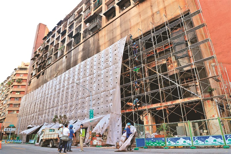 高雄市政府昨雇工在城中城門面搭起鷹架,圍上布幕,避免建物崩落傷人。圖/林伯東