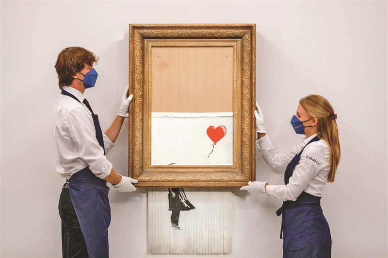 法新社報導,事實上,〈垃圾桶裡的愛〉(Love is in the Bin)前身是〈氣球女孩〉(Girl with Balloon)。2018年,〈氣球女孩〉在倫敦蘇富比拍賣會上以110萬英鎊(約新台幣4228萬元)的價格拍出後,隨即被畫框中暗藏的碎紙機絞碎掉一半。