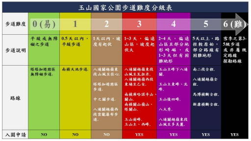 玉管處依據登山之行程天數、危險地形及雪季規畫分級管理制度,可提供民眾按部就班之登山認知,避免因輕忽而增加山難風險,也希望透過分級制度,讓民眾在從事登山活動時,做好事前準備計畫、身體狀況評估,應確實依計畫行進與宿營,配合玉管處提供的服務設施,山友發揮自我負責精神,才能提升登山安全。