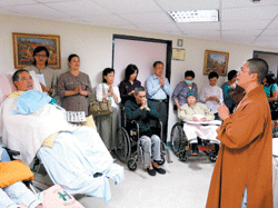 而現場除了有佛光合唱團咸臨分團帶來的美妙歌聲外,台北道場監院覺華法師也為漸凍病友加油打氣,並為他們祈福祝禱。覺華法師表示,雖然病友的身體無法自由活動,但心靈卻可以隨著心境的轉換自由翱翔,藉由佛法的滋潤與心念的轉移,幫助自己可以離苦得樂、不起煩惱。