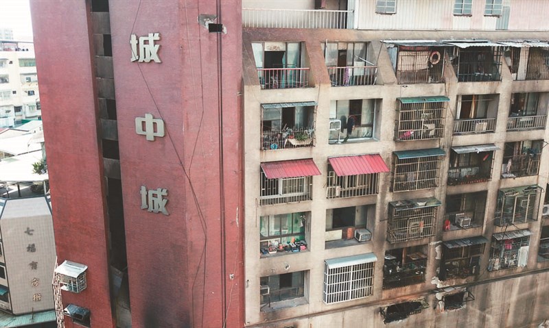高雄鹽埕區「城中城」大樓日前發生火警,從高空畫面可見府北街正面七樓以上許多套房的窗戶都被鐵窗堵死,無法逃生。圖/林伯東