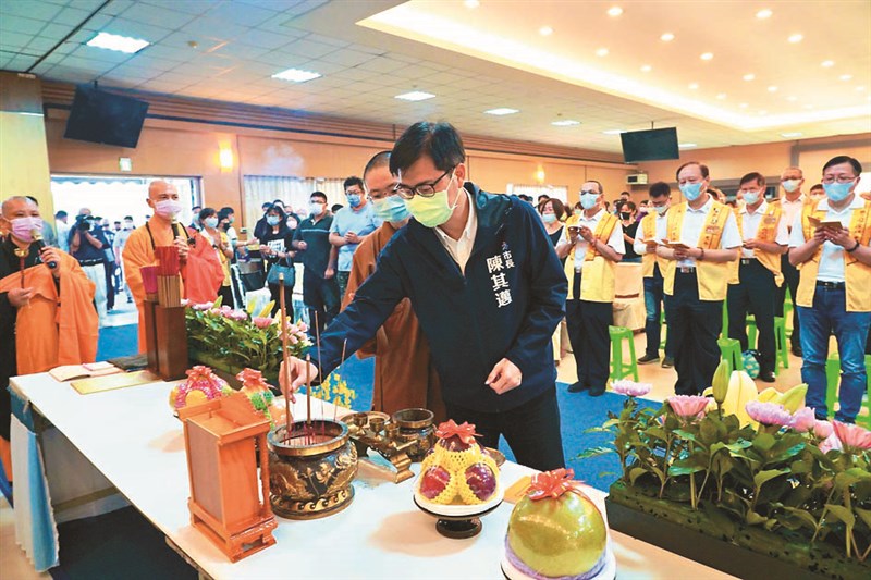 【人間社記者宋滌姬高雄報導】高市府昨日在高雄市立殯儀館景行廳舉行「城中城大樓火災罹難者豎靈法會」,高雄市長陳其邁、主任祕書楊明州、社會局長謝琍琍等市府團隊共同出席,親自上香致意,慰問家屬,現場有佛光山150位佛光會員及社會大眾等前來助念。