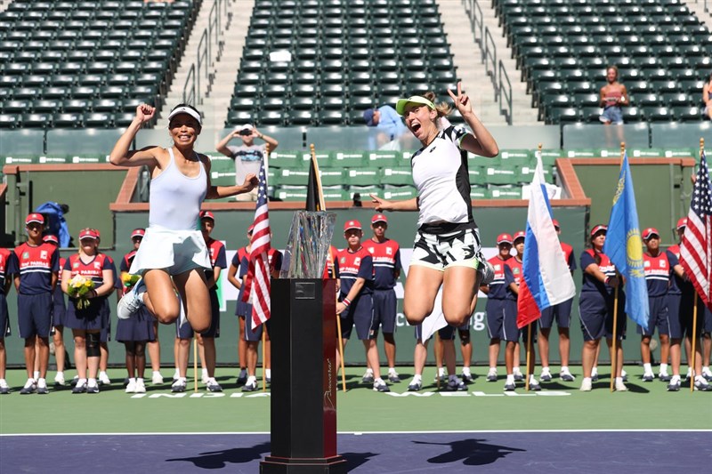 謝淑薇(左)和夥伴梅騰絲(Elise Mertens)拿下雙打冠軍。圖/印地安泉網賽官方推特