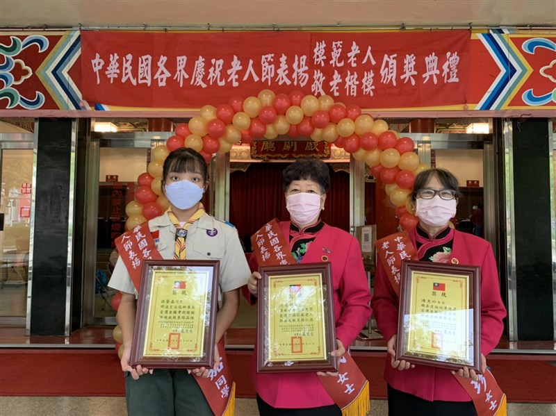 中華民國老人福利協進會為慶祝第56屆老人節,舉行表揚全國模範老人暨敬老與孝親楷模頒獎典禮,佛光會今年一舉囊括三獎,監事洪金娥(中)獲頒「模範老人」獎,會長陳惠珍(右)、童軍團孫藝嘉也分別榮獲「敬老楷模」、「孝親楷模」獎肯定。圖/記者曹麗蕙