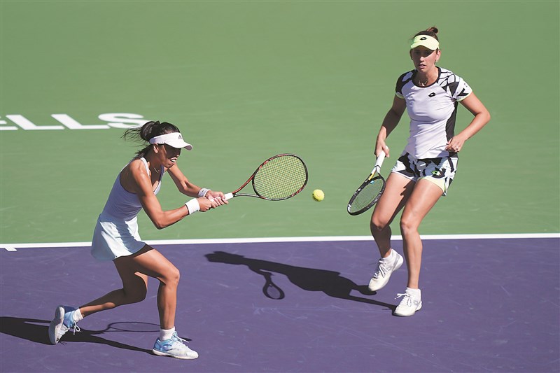 謝淑薇(左)/梅騰絲,在印地安泉網賽女雙冠軍賽,力退庫德梅托娃/芮芭奇娜組合。圖/美聯社