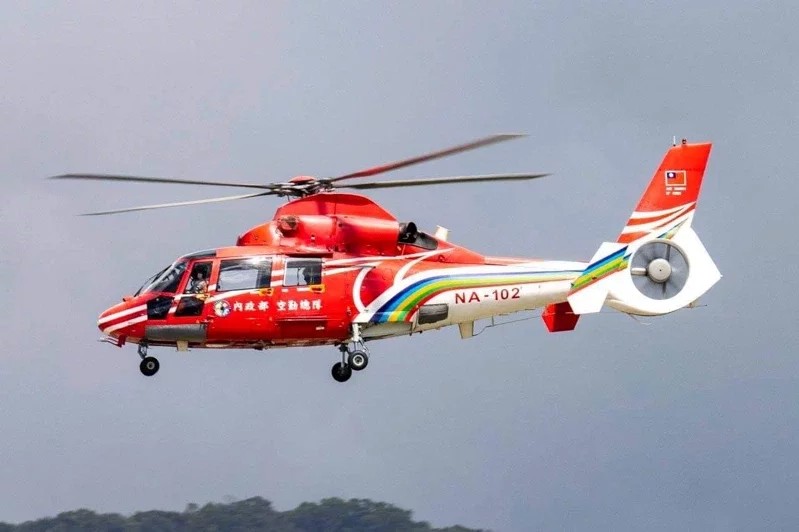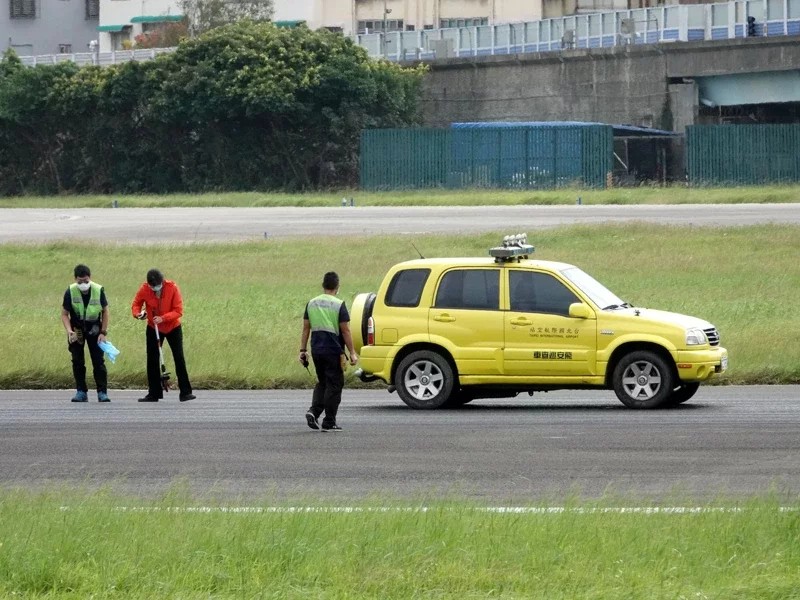 空勤總隊海豚直升機上午在松山機場重落地,飛安巡查人員在現場採證。圖/邱德祥