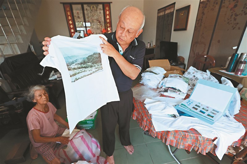 新北貢寮雞母嶺「水T藝術節」策展人蕭學苑(右)成功募得一百二十件T恤,拿著昔日梯田舊照片訴說具220年歷史的梯田文化。圖/潘俊宏