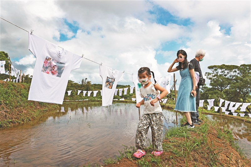 新北貢寮雞母嶺「水T藝術節」開幕當天,參展民眾帶著家人走在田埂上看著隨風飄逸的水T。圖/潘俊宏