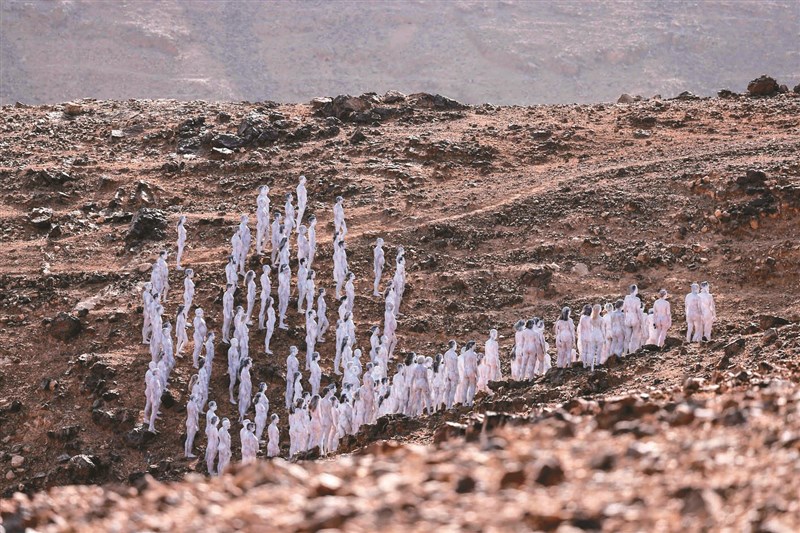 約300人報名參加美國藝術攝影師圖尼克的裸照裝置藝術,希望吸引世人注意保護死海的重要性。尼克表示選用白色彩繪人體,是以聖經故事「羅德的妻子」為靈感,故事中她變成一根鹽柱。圖為白色彩繪的參加者,17日在死海以西15公里阿拉德市周邊的沙漠拍照。圖/法新社