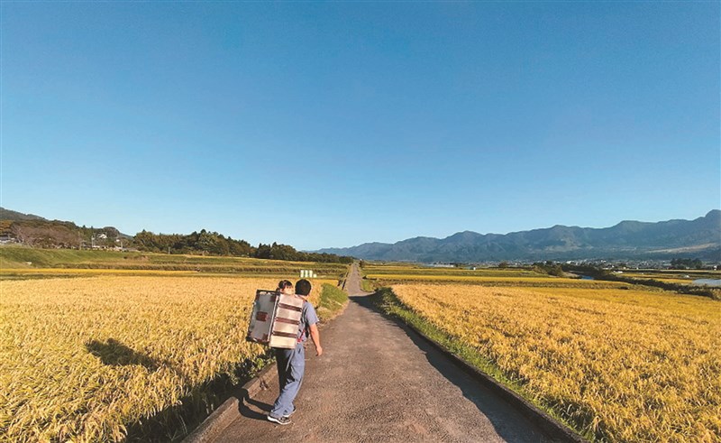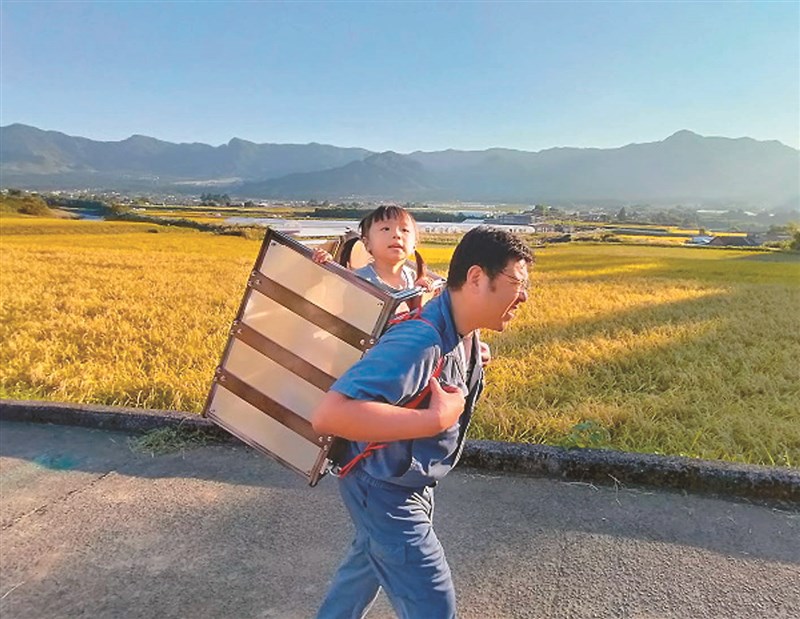 爸爸用自製「禰豆子箱」,背著女兒在鄉間散步。圖/取自推特@asokara