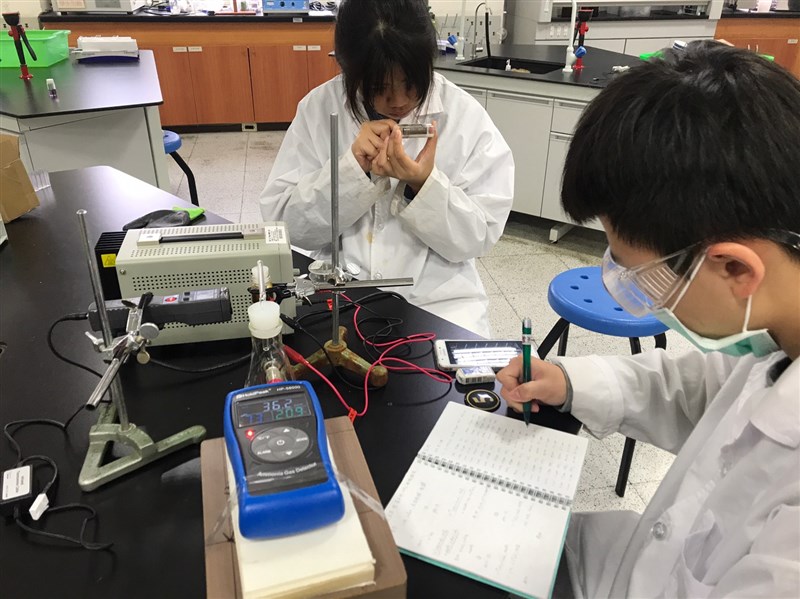 普通型高中金牌獲獎成員及使用之模擬觸媒轉化器裝置。圖/教育部提供