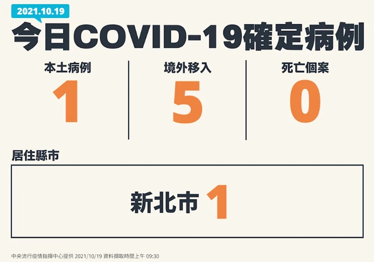指揮中心說明,今日新增5例境外移入個案,為4例男性、1例女性,年齡介於10多歲至60多歲,分別自美國(2例,案16448、案16452)、阿拉伯聯合大公國(案16449)、菲律賓(案16450)、馬來西亞(案16453)入境,入境日期介於10月5日至10月17日之間,均持有搭機前3日內檢驗陰性報告。