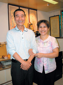 吳春桃生長在佛教家庭,從小就發願做善事幫助別人,皈依後發願那裡需要幫忙就到那裡去。賴旭麟經朋友介紹到三重禪淨中心學習佛法,吳春桃看到他研修佛法日益精進,也跟著到道場當義工,現在兩人分別是道場的交通義工、知賓師姐。他們表示,在佛法熏陶下能不斷成長,且依恃的是正信佛教,所以當遇到任何難事,都因「有佛法,就有辦法」得以迎刃而解。
