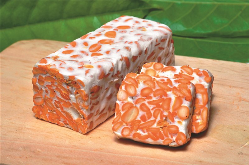 吳筱筑表示,天貝(Tempeh)是印尼的傳統發酵食物,大多由黃豆製成,作法是將黃豆浸泡發酵四十八小時後,再進行脫膜、蒸熟、加入天貝菌,最後再進行第二次發酵四十八小時,即能製成天貝。