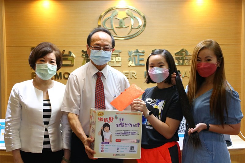 莞淳(右二)在媽媽(右一)陪同下捐出留了6年、長達60公分長髮,同時也捐出壓歲錢支持假髮製作經費。由台癌基金會執行長賴基銘(左二)、副執行長蔡麗娟(左一)代表接受。圖/台灣癌症基金會