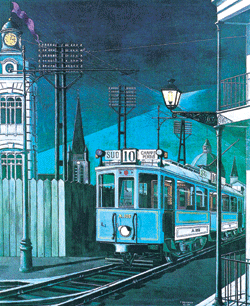 氣氛有些凝結,畫家似乎獨鍾於這樣的不尋常情境。畫筆偏向藍調的訴說,在沒有人的站台和站台四周,悠然奏起這夜的淒涼曲音,彷彿夜才是它們的舞台,夜才是它們免於白日喧囂、人群騷擾的美麗時光,對它們而言,人類一點都不可愛,甚至有些聒噪。