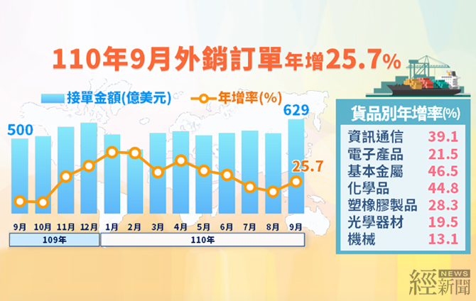 外銷訂單連19個月正成長 全年有望首度衝破6千億美元 |2021.10.20 語音朗讀 1280觀看次 字級 大 中 小 經濟部表示,9月外銷訂單創歷史新高、連19個月正成長,今年可望首度突破6000億美元(約新台幣16.7兆元)大關。圖/Unsplash 【本報台北訊】經濟部今(20)日表示,電子、資通訊產品表現亮麗,9月外銷訂單金額衝上629億美元(約新台幣1.7兆元),創歷史新高、連19個月正成長;預估10月接單至少630億美元,累計將超越去年全年的5336.6億美元(約新台幣14.8兆元),今年可望首度突破6000億美元(約新台幣16.7兆元)大關,再創新高。經濟部統計處今天公布9月外銷訂單金額為629億美元,年增25.7%,不僅創歷史新高,也是連續19個月正成長;第三季同樣創歷史新高,金額為1717.1億美元(約新台幣4.7兆元),年增21.7%。數據顯示,今年前9月外銷接單金額為4816.3億美元(約新台幣13兆元),較去年同期成長32.4%,金額創歷年同期新高,增幅也是民國77年以來同期最大。圖/經濟部統計處長黃于玲分析,儘管宅經濟逐漸退燒,不過,各界對電子與資通訊產品有剛性需求,無論是工作或生活,都會加深數位化程度,特別是疫後5G、高效能運算、車用電子等新興科技應用持續擴展,台灣正好擁有半導體優勢,有助電子產品接單。觀察主要貨品表現,電子與資通訊產品是推升9月接單金額創新高的主力,電子產品9月接單金額為194.9億美元(約新台幣5407億元),寫下歷史新高,年增21.5%,已連續20個月呈雙位數成長。黃于玲指出,智慧手機等消費性電子新品上市、年底備貨需求及高效能運算等新興科技應用續增,帶動晶片通路、晶圓代工、記憶體、印刷電路板、封測等接單成長。圖/Unsplash資通訊產品接單金額193.9億美元,年增39.1%,則創歷史同月新高,為連續12個月正成長,黃于玲分析,主因同樣受到智慧手機新品陸續上市激勵,以及去年延後上市效應,比較基數偏低,讓組裝代工訂單增幅偏高。光學器材方面,雖然面板價格持續走跌,但仍高於去年同期,加上筆電等大尺寸面板及車載、商用、工控應用面板需求成長,推升相關接單金額至28.7億(約新台幣800億元)美元,年增19.5%,連續16個月正成長。至於傳統貨品,黃于玲說,在全球景氣回溫及原材物料價格續居高檔2因素下,各項產品價量齊揚,基本金屬年增46.5%、機械年增13.1%、塑橡膠製品年增28.3%、化學品年增44.8%。圖/Unsplash依主要接單地區來看,美國9月接單金額創歷史新高,中國大陸及香港、歐洲、東協則續寫歷年同月新高,多以資通訊、電子產品為主,其中,美國接單金額為192.9億(約新台幣5379億元)美元,年增29.3%,為連續20個月正成長。展望未來,黃于玲指出,第四季將進入歐美年終銷售旺季,消費性電子備貨需求逐漸出籠,以及國際原物料價格維持高檔,各大貨品接單都能穩健成長,預估10月接單金額為630億(約新台幣1.7兆元)至645億美元,年增22.1%至25%。由於前9月接單金額為4816.3億美元(約新台幣13兆元),黃于玲表示,保守估計的話,前10月接單金額至少為5446.3億美元(約新台幣15兆),已超越去年全年的5336.6億美元(約新台幣14.8兆元),今年有機會首度突破6000億美元大關,再創新高,增幅可望超過20%。 前一篇文章 全台罕見高蹺、竹馬陣 傳藝「鬥陣趣」登場 下一篇文章 85歲指揮殷巴爾隔離期滿 攜手3音樂家演出 熱門新聞 01屏東.春日 太陽之子南島風 陶壺印記排灣情2026.01.2602【研朱札記】《臺灣文學》的 誕生地──山水亭2026.01.2703【藝象空間】內觀造景 哲人哲思 ──楊英風的大乘景觀2026.01.2504吃素好體力 霍諾德登頂101 2026.01.2605天元宮聯名幾米 邀您一起賞櫻花2026.01.2506【閃文集】獨特自主的貓咪2026.01.2707【獻給動物朋友的詩】站成蘭花的螳螂與嘗到幸福滋味的蜂2026.01.2908【紙粹的家】用故事說故事2026.01.2509澳網 辛納拚3連霸 小蠻牛盼全滿貫2026.01.3010【傳燈六十‧百年仰望】星雲大師一筆字書法紀念特展概述2026.01.30 訂閱電子報 台北市 天氣預報 台灣一週天氣預報 相關報導 魯比歐:習視統一為歷史使命陳菊辭監察院長 李鴻鈞代理睽違24年 央行啟動新台幣改版海鯤號6度海測 台船:安全無虞下交艦金門馬 逾千大陸跑者成亮點陸海警侵擾金門 海巡署強勢驅離
