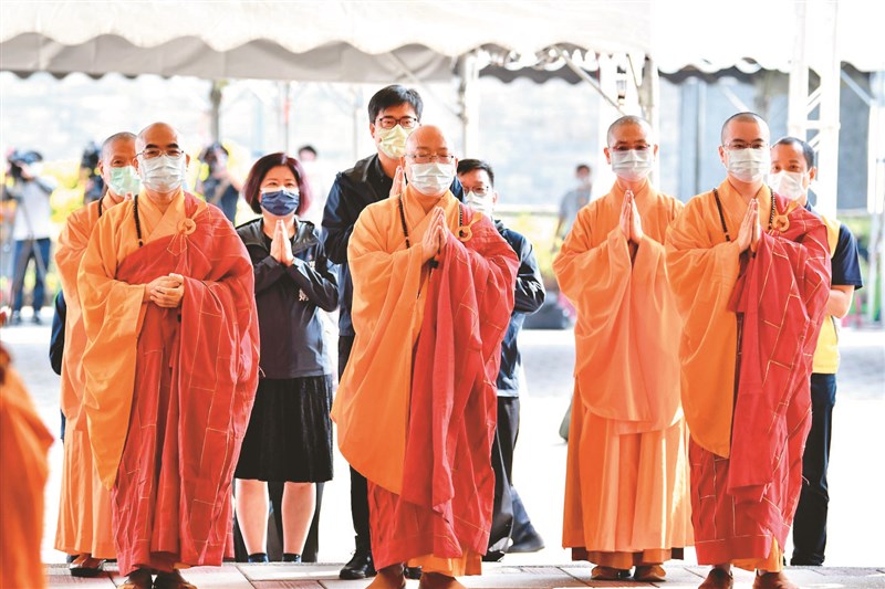 佛光山常務副住持慧傳法師(左)陪同高雄市長陳其邁(左二),一同恭誦佛號及《佛說阿彌陀經》。圖/人間社記者趙啟超