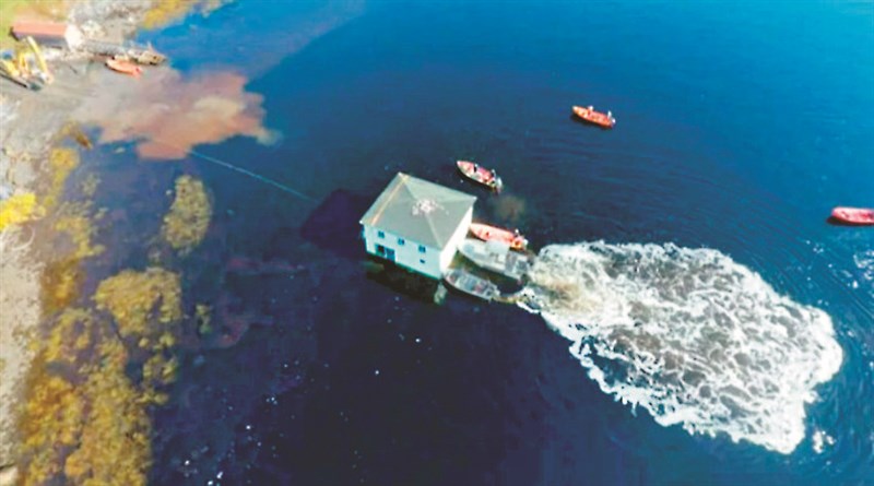 【本報綜合外電報導】加拿大紐芬蘭島鄰近海域日前出現奇特畫面,一棟二層樓木房在多艘船跟工程車的牽引下,搖搖晃晃「飄洋過海」,搬到另一處緊鄰海濱的土地上。