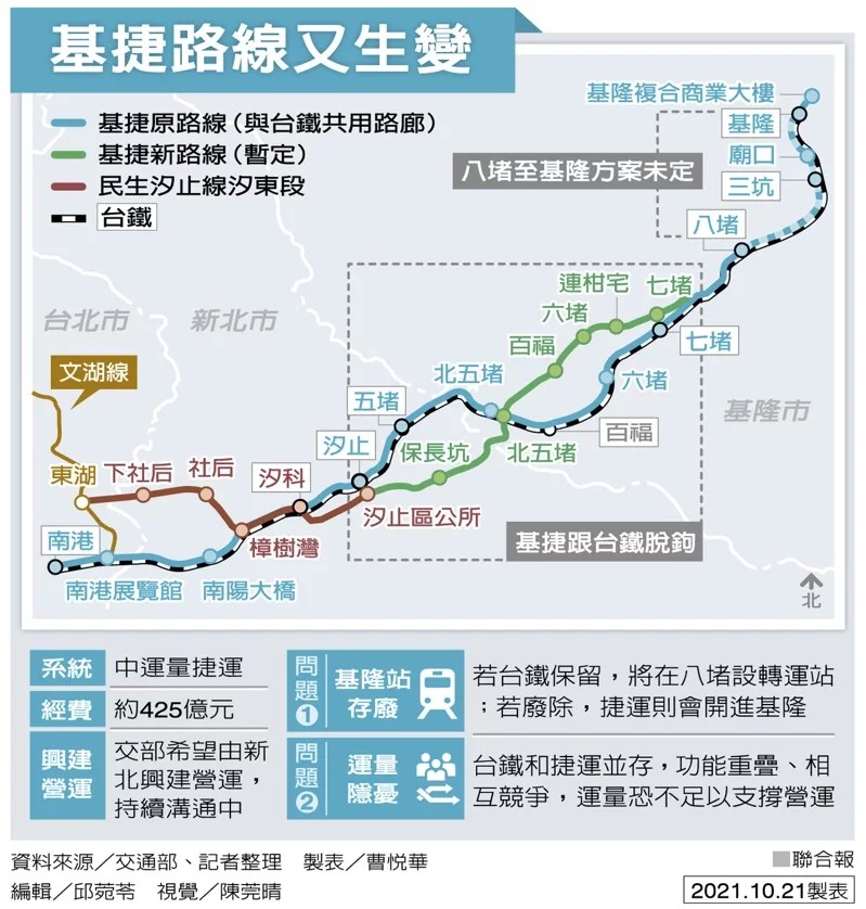 【本報基隆訊】基隆捷運出現重大變化,交通部長王國材昨(21)說,原與台鐵共用路廊的基捷確定改變路線,第一階段八堵到南港段幾乎與台鐵「脫鉤」,將走進人口較多的基隆七堵市區、百福社區,也會轉進新北汐止區公所與捷運民生汐止線第一期工程(汐東線)整合,確切路線於下周拍板,總經費約425億元,交通部希望由新北市興建和經營。