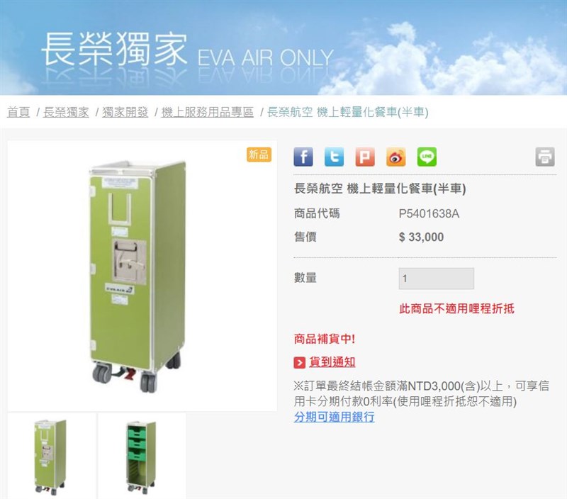 長榮購物網出現「機上餐車」 3.3萬元完售補貨中! |2021.10.22 語音朗讀 2887觀看次 字級 大 中 小 「長榮樂e購」購物網站出現機上餐車,價格33000元全部售完補貨中,引發熱烈討論。圖/長榮樂e購 【本報台北訊】疫情時代賣什麼都不奇怪。長榮航空21日在臉書上宣布開賣機上餐車,兼具實用與趣味的收藏,引發熱烈討論。不過由於採限量販售,目前已完售。長榮在臉書上表示,若後續有加碼會再通知。圖/長榮樂e購根據長榮臉書內容顯示,機上餐車航空迷必收,餐車上附活動式抽屜三入,抽屜間距可彈性調整,可收納餐具、飲料罐等各式不同體積的物品;關上車門、扣上門閂,磁吸式安全無虞;有綠色、紅色踏板,自由移動、安置、煞車箭步達成。可讓家搖身一變成為機艙,回憶起飛行中美好點滴的獨特收納家飾品。長榮樂e購網頁也顯示,該餐車都是新品,每個售價3萬3000元。目前已完售,商品補貨中。開賣消息一出掀起討論,就有網友說「下次開賣1:1 駕駛艙我也不覺得奇怪」、「下一檔是賣飛機了嗎」、「請問有附贈空少嗎?」、「有沒有賣椅子。」圖/長榮樂e購圖/長榮樂e購新冠全日空出奇招 全新餐車、座椅開賣不只長榮樂e購販售「機上餐車」,之前日本全日空(ANA)就曾在官網販售飛機上的物品,從「機上餐車」連「機艙座椅」都有賣!雖然是用來做測試或發表會亮相樣品,不是直接從飛機上拆下來的椅子,但和真實飛機上使用並無太大差異。圖/line today販售的機艙座椅包含了777-300ER經濟艙和豪經艙,以及日本國內線premium的座椅各限一組,售價分別為65萬日圓(約新台幣16萬2000元)、70萬日圓(約新台幣17萬5000元)及60萬日圓(約新台幣15萬元)。不過並不是有錢就能買到,而是必須先上網登記,抽到才有資格購買!圖/line today 前一篇文章 北東部溼涼至周日 下周一逐漸回溫 下一篇文章 太平山山毛櫸披金黃新衣 明起8天日限200輛車 熱門新聞 01佛光山大學校長論壇 盼教育融入佛法2025.11.0802星雲大師全集⑲【佛教管理學②】禪門的管理法⑦2025.11.0803【養生百味】冬食淡素 防範疾病2025.11.0804鳳凰將轉中颱 下周二雨勢最大2025.11.0805電塔變身巨獸 奧地利新地標2025.11.0806陸航母福建艦服役 首採電磁彈射2025.11.0807更年力綻放 迎向第二黃金人生2025.11.0808高市早苗:台灣有事 日本擬行使集體自衛權2025.11.0809尼泊爾農民 古城晒稻米2025.11.0810【樹博士系列】土壤的祕密XV 水稻田減排新觀念IV 土地的溫柔革命 雲林大埤寫益生菌奇蹟2025.11.09 訂閱電子報 台北市 天氣預報 台灣一週天氣預報 相關報導 遊茂林 賞紫斑蝶捷運三鶯線 串連文創生活圈迎銅鑼杭菊季暴雨襲蘇澳 千戶泡水成光復2.0154縣道榕樹藏危機 評估移樹鳳凰來襲 菜農搶收和時間賽跑