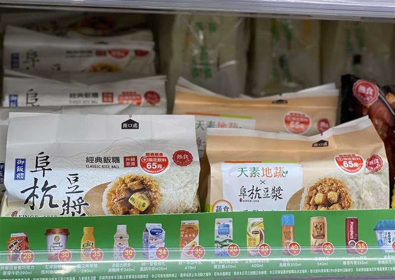 7-ELEVEN架上有兩款阜杭豆漿飯糰,蔬食飯糰上有特別標示「蔬食」,素食者別拿錯囉。圖/記者楊旻芳
