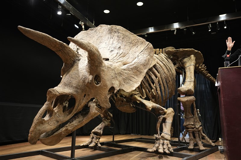 迄今出土最大的8公尺長三角龍骨架化石,在巴黎時間21日以660萬歐元(約新台幣2.2億元)成交,創歐洲新紀錄。圖/美聯社