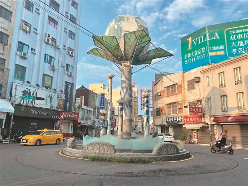 彰化市精華區和平路與中華路口的「三角公園」,完工不久即故障,現在只剩蓮花燈塔造景。圖/劉明岩