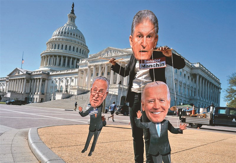 一名關心氣候變遷的抗議者,在國會大廈前扮演阻擋與氣候及潔淨能源預算的民主黨參議員曼欽,嘲諷他操控拜登總統和參院多數黨領袖舒默。圖/美聯社
