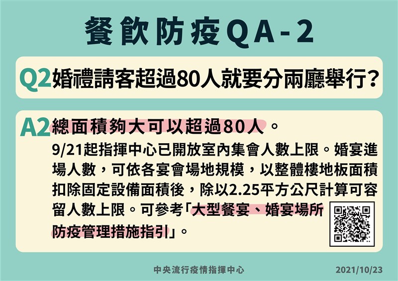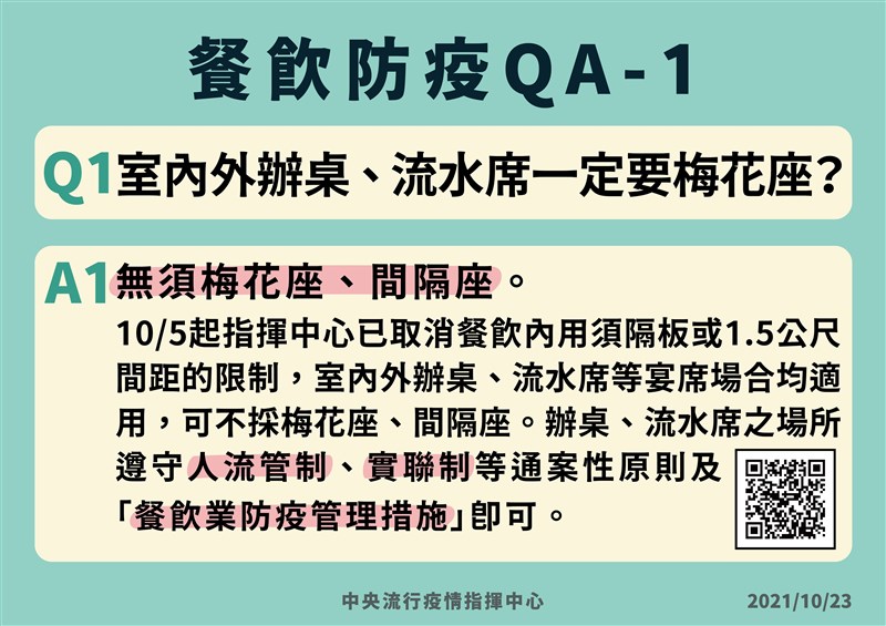 疫情穩定 流水席辦桌不需梅花座 |2021.10.23 語音朗讀 1770觀看次 字級 大 中 小 圖/取自林皇宮臉書 【本報台北訊】國內新增7例COVID-19確定病例,均為境外移入;另確診個案中無新增死亡。中央流行疫情指揮中心指揮官陳時中指出,今天本土確診0例,近日疫情相對穩定,每周日記者會原則上停開,若有相關案例數當天會用新聞稿發布,除重大新聞外,停開周日記者會。隨著國內疫情趨緩,許多場所已逐步開放,針對餐飲的防疫規定,陳時中再度說明,他說,包括請客宴席的人數,基本上以容留空間來計算總人數,現在不需梅花座、沒有隔板限制。另外室外辦桌流水席,現在只有總人流人數限制,沒有其他特別規定。圖/指揮中心提供陳時中表示,關於請客大型宴席,有民眾疑惑是否一個廳不能超過80人,指揮中心要澄清「沒有」,基本上容留空間內,就是用2.25平方公尺來計算總人數,現在沒有梅花座、沒有隔板限制,盡量不要太擁擠,若要起身移動,最好盡量戴口罩。至於辦桌辦流水席,陳時中表示,中南部比較多舉辦,地方常常以為租借場地要符合梅花座、隔板,否則無法租,中央要強調,室內外辦桌或流水席,跟所有餐飲規定一致,目前只有總人留人數限制,沒有其他特別規定。餐飮防疫2QAQ:室內外辦桌、流水席一定要梅花座?A:無須梅花座、間隔座。10月5日起指揮中心已取消餐飲內用須隔板或1.5公尺間距的限制,室内外辨桌、流水席等宴席場合均適用,可不探梅花座、間隔座/桌、流水席之場所遵守人流管制、實聯制等通案性原則及「餐飲業防疫管理措施」。圖/指揮中心提供Q:婚禮請客超過80人就要分兩廳舉行?A:總面積夠大可以超過80人9月21日起指揮中心已開放室內集會人數上限。婚宴進場人數,可依各宴會場地規模,整體樓地板面積扣除固定設備面積後,除以2.25平方公尺計算可容留人數上限可參考「大型餐宴、婚宴場所防疫管理措施指引」。圖/指揮中心提供指揮中心說,今日新增7例境外移入個案,為5例男性、2例女性,年齡介於10多歲至60多歲,分別自美國(案16468)、賽普勒斯(案16469)、馬來西亞(2例,案16470、16473)、印尼(案16471)、柬埔寨(案16472)、蒙古(案16474)入境,入境日介於10月10日至10月21日,皆持有搭機前3日內檢驗陰性報告。 前一篇文章 NBA/保羅成為「2萬分+1萬助攻」第一人 率太陽隊拿到本季首勝 下一篇文章 北市勞教課免費派任講師 單位申請千人受益 熱門新聞 01【詩】與光行2026.01.1902【素人攝影】美夢成真 遇見幸福極光 2026.01.1803大陸絕美書店 奇幻閱讀旅程2026.01.1804小氣泡能量大2026.01.2005星雲大師全集⑳【佛教管理學②】佛教的「梵唄音樂」管理學⑧2026.01.1806聯合國示警 全球水資源破產2026.01.2207海洋音樂家 鯨魚神祕吟唱2026.01.1808大學學測 計算量大數學A近年最難2026.01.1809微細氣泡 用途也很多2026.01.2010抹香鯨 靠方言暸解親族關係2026.01.18 訂閱電子報 台北市 天氣預報 台灣一週天氣預報 相關報導 挺1.25兆軍購 AIT:自由非免費海鯤號再現身 海測前做準備汽車與農產品 美要求開放市場台美關稅談判 鄭麗君今說明周折汪喵嘉年華 總統籲零棄養高雄新材料循環產業園區