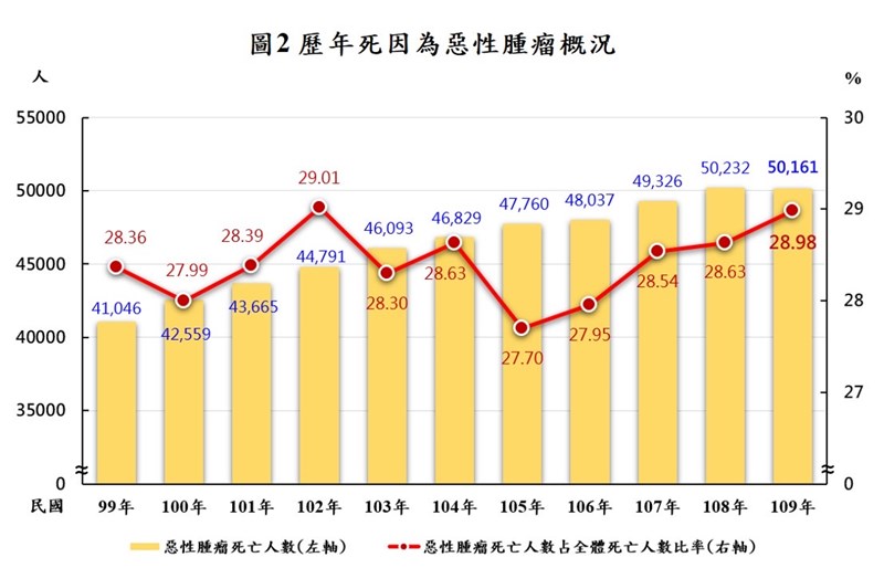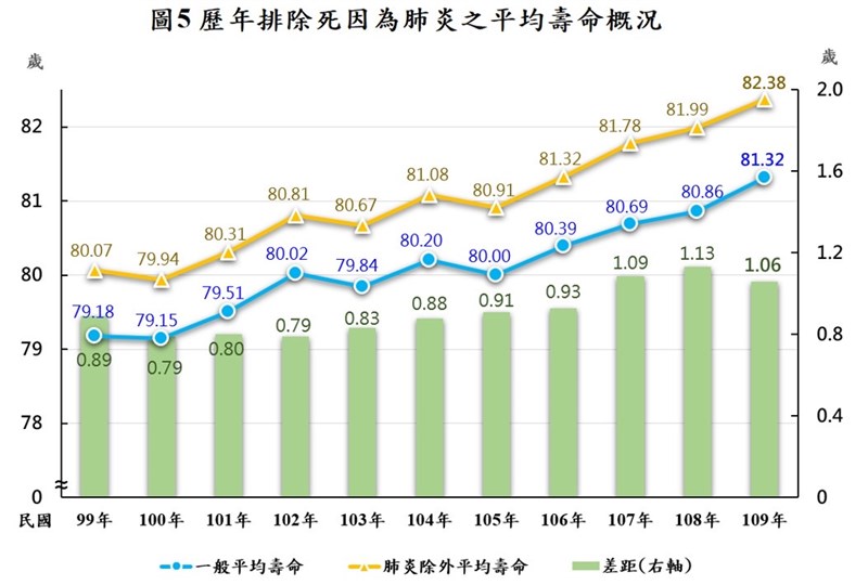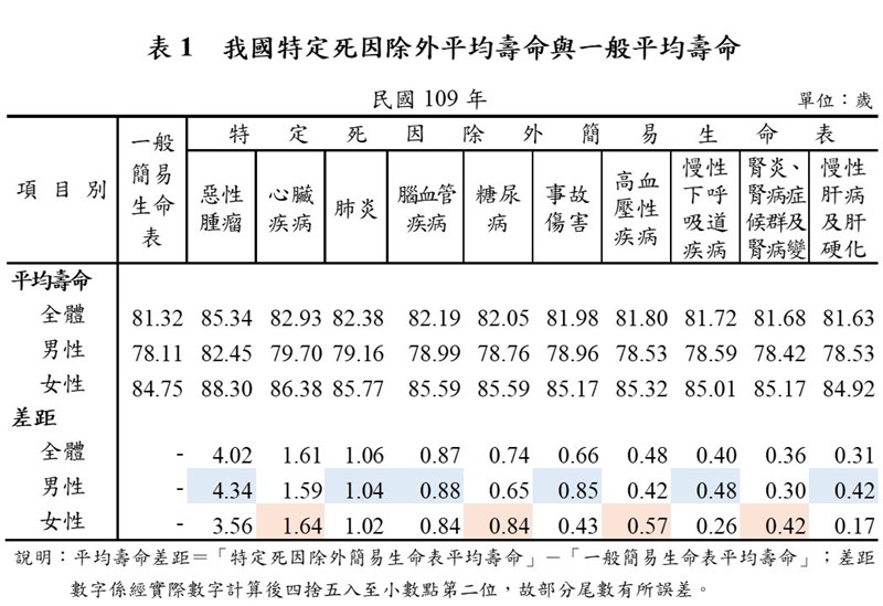 排除惡性腫瘤 去年平均壽命提高4.02歲 |2021.10.23 語音朗讀 1364觀看次 字級 大 中 小 歷年死因為惡性腫瘤概況。圖/內政部提供 【本報台北訊】內政部今日公布「2020年特定死因除外簡易生命表」,10大死因如排除居國人死因之首的惡性腫瘤,2020年國人平均壽命為85.34歲,較一般平均壽命81.32歲增加4.02歲,影響最大;排除居死因第2位的心臟疾病,平均壽命可增加1.61歲;排除居死因第3位的肺炎,平均壽命將增加1.06歲。內政部表示,為了解各類死因對國人平均壽命的影響程度,特別運用衛生福利部統計的2020年國人前10大死因死亡人數,編算我國各特定死因除外的國人平均壽命,並與一般國人平均壽命比較其差距,兩者間壽命差距愈大,代表該類死因減損壽命愈嚴重,對於國人平均壽命影響愈明顯。內政部指出,居10大死因首位的惡性腫瘤,其死亡人數已連續39年居國人死因首位,2020年死亡人數為5萬161人,且近4年來,其死亡人數占全體死亡人數的比率也在逐年攀升,皆在2成7以上。編算結果發現,排除特定死因為惡性腫瘤的平均壽命與一般平均壽命差距,近4年來呈緩增現象,值得重視。歷年排除死因為肺炎之平均壽命概況。圖/內政部提供另肺炎為國人10大死因第3位,死亡人數及其占全體死亡人數比率自2014年來首次呈現減少。經統計,排除死因為肺炎的平均壽命與一般平均壽命的差距,由2019年1.13歲略減為2020年1.06歲。內政部進一步表示,從性別觀察,各特定死因除外平均壽命與一般平均壽命的差距,男性高於女性的死因包括惡性腫瘤、肺炎、腦血管疾病、事故傷害、慢性下呼吸道疾病、慢性肝病及肝硬化;女性高於男性者包括心臟疾病、糖尿病、高血壓性疾病與腎炎、腎病症候群及腎病變,顯示各類死因對兩性平均壽命的影響程度有所不同。我國特定死因除外平均壽命與一般平均壽命。圖/內政部提供 前一篇文章 疫苗嚴重過敏反應 5大症狀一次看 下一篇文章 南迴「藍皮解憂號」今復駛 藍皮加海景好療癒 熱門新聞 01WTA、ATP年終賽 獎金創新高2025.11.0702健保補充保費變革 政院急踩煞車2025.11.0703補充纖維、鈣、鎂、鉀 預防多種疾病風險2025.11.1104再闖WTA年終賽 謝淑薇力拚第2冠2025.11.0705【寬鼎畫語】 看不見的真相2025.11.1006【詩】再現綠川2025.11.0707佛光山大學校長論壇 盼教育融入佛法2025.11.0808【樹博士系列】土壤的祕密XV 水稻田減排新觀念IV 土地的溫柔革命 雲林大埤寫益生菌奇蹟2025.11.0909佛光山深耕紐西蘭 毛利族傳統禮致謝2025.11.0710星雲大師全集【傳記】百年佛緣─生活篇 我的衣食住行 5-52025.11.07 訂閱電子報 台北市 天氣預報 台灣一週天氣預報 相關報導 迎銅鑼杭菊季暴雨襲蘇澳 千戶泡水成光復2.0154縣道榕樹藏危機 評估移樹鳳凰來襲 菜農搶收和時間賽跑芬普尼蛋場 食藥署:逐批查驗玉山觀高山屋 下月起收費